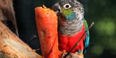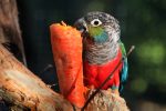 Crimson-bellied-Conure-is-loving-the-large-carrot-wedged-into-perching-Paradi...
